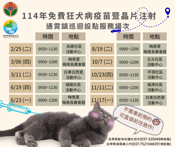 今年度免費狂犬病疫苗暨晶片注射巡迴進行中,歡迎有需要的民眾免預約自行前往。